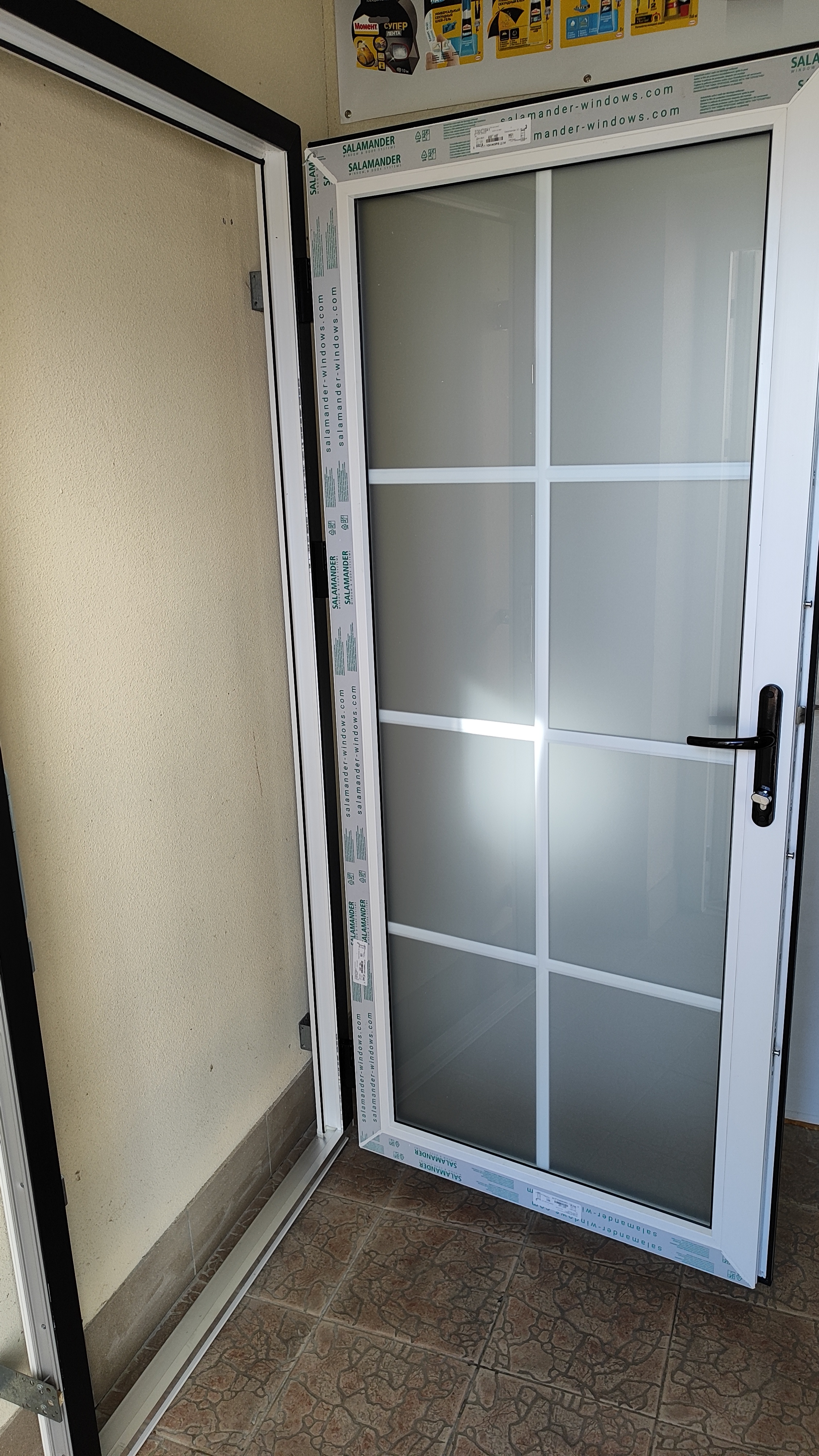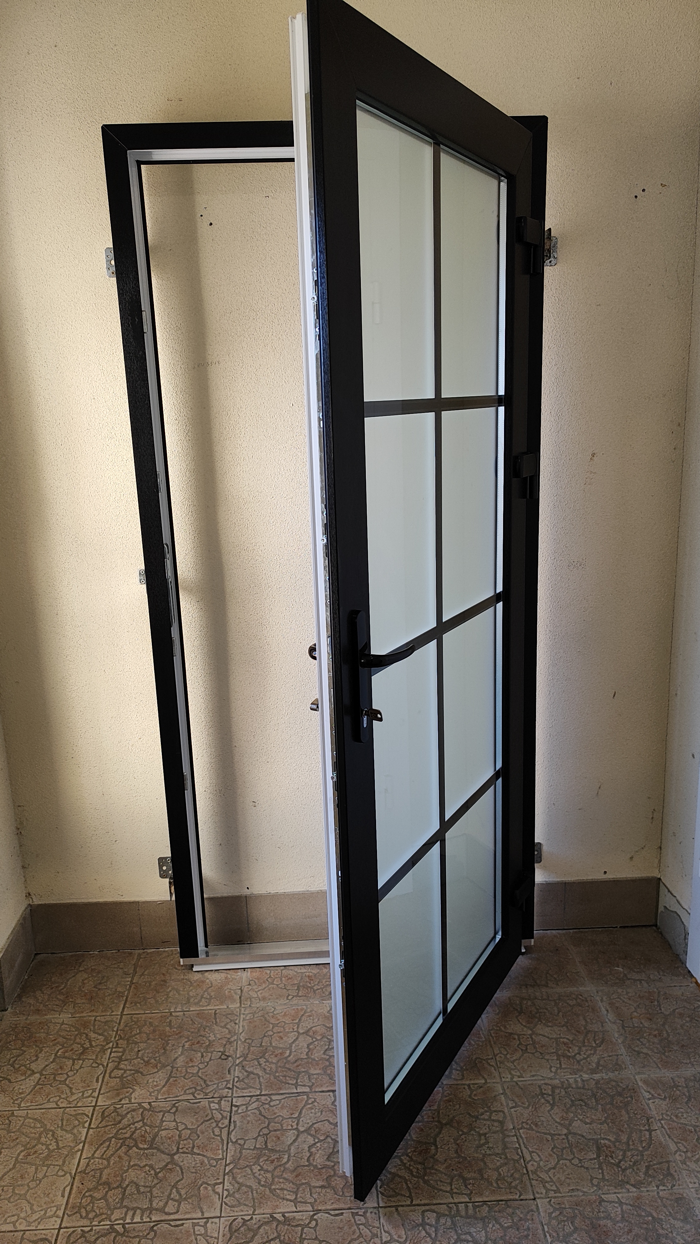 Под заказ. Пластиковая дверь из ДВЕРНОГО профиля ш960*в2050. Наружная ламинация черного цвета. Заполнение однокамерный стеклопакет с матовым напылением. Внутри стеклопакета имитация в цвет ламинации. Алюминевый порог. Запирание : нажимной гарнитур + замок с ключем.МНОГОЗАПОРНЫЙ ЗАМОК. Бывают правые и левые (уточняйте наличие)